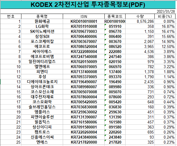 다음은 KODEX 2차전지산업 ETF(상장지수펀드) 상품의 구성 종목을 알아보자