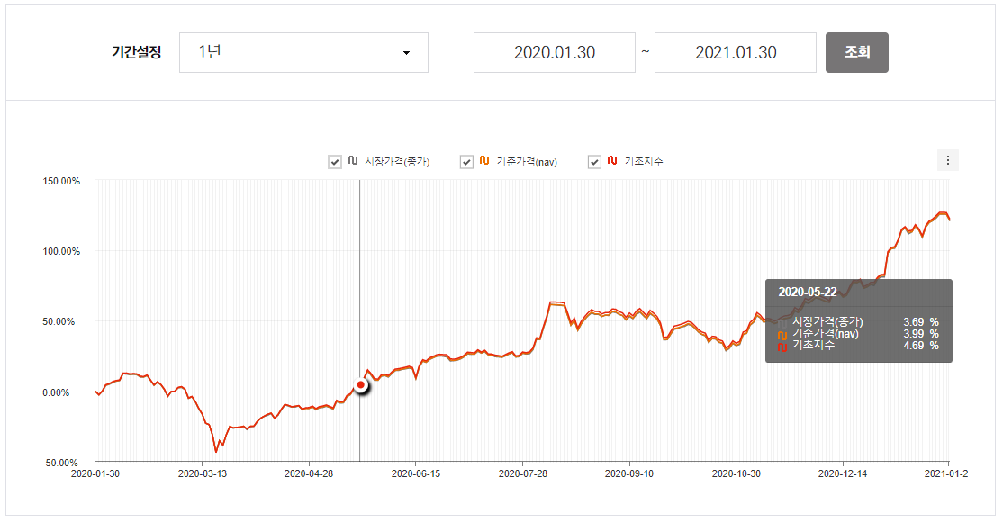 TIGER 2차전지테마 ETF(상장지수펀드상품)의 최근1년간의 수익율 그래프를 살펴보자