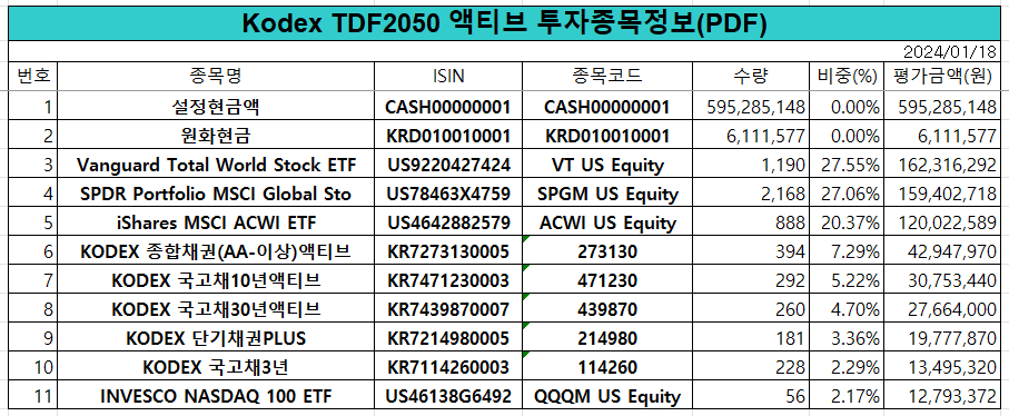 2024년 1월 17일 현재 KODEX TDF2050액티브 ETF 상품의 구성종목은 다음과 같습니다.