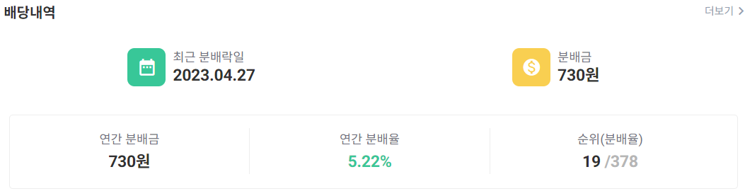 - 분배금: 배당금 발생시 1,4,7,10월 마지막 영업일 및 회계기간 종료일 기준 지급(연배당임)